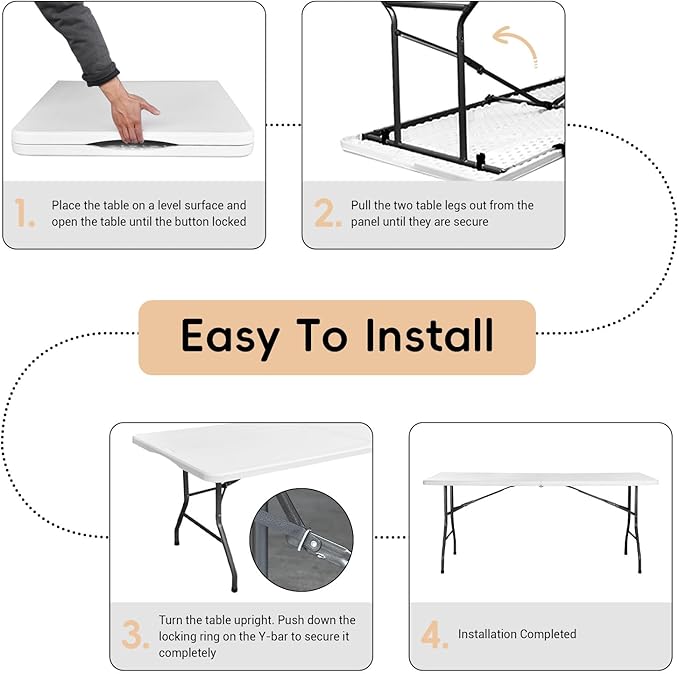 - Easy To Store:The folding banquet table totally weigh about 26 pounds, and an adult can complete the installation independently. The foldable design of the table allows you to fold it up when not in use, making it easy to carry or store in a compact space